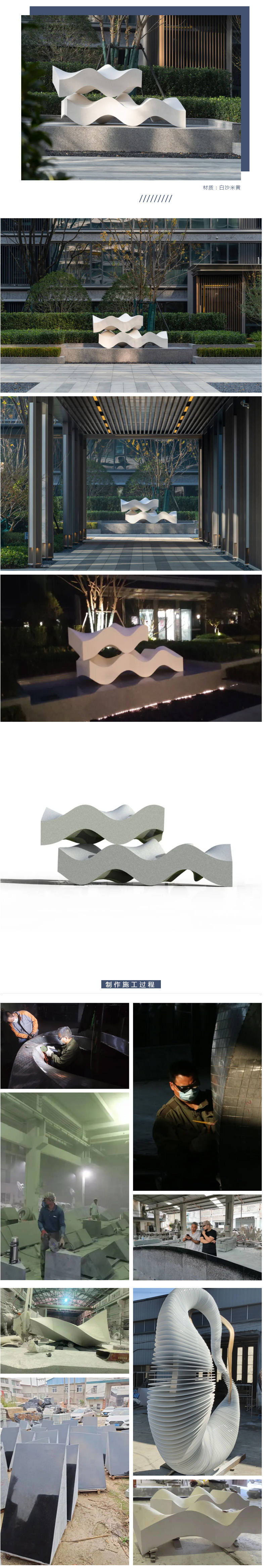 以浪潮的各種形態(tài)為靈感作為設(shè)計出發(fā)點,過程中嘗試了例如折面、格柵等多種表現(xiàn)手法,但不銹鋼材質(zhì)所呈現(xiàn)的效果始終與小區(qū)的環(huán)境氛圍較違和,設(shè)計組經(jīng)過反復(fù)推敲,最終確定采用白沙米黃石材。
