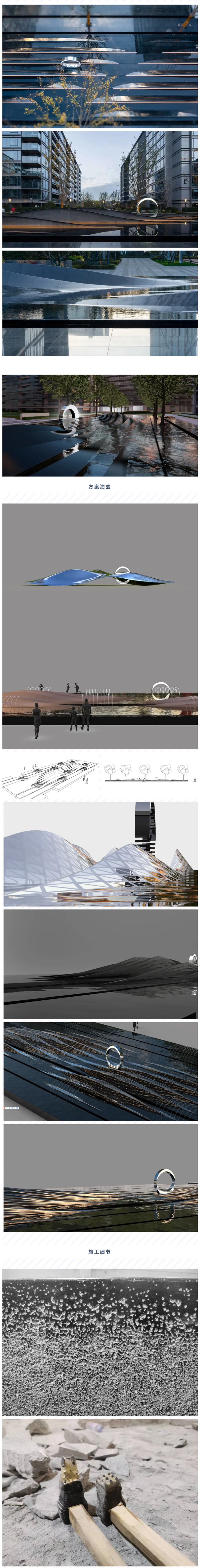 進(jìn)入小區(qū),正對入口水景處的【心覓潮境】,作品的構(gòu)思從宏觀和微觀兩個角度出發(fā),一方面想要通過提取浪潮涌動的線條元素,另一方面則是將水分子的形態(tài)演變?yōu)榈袼艿募±怼?/p>