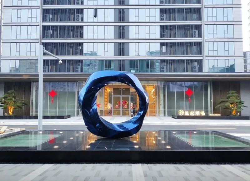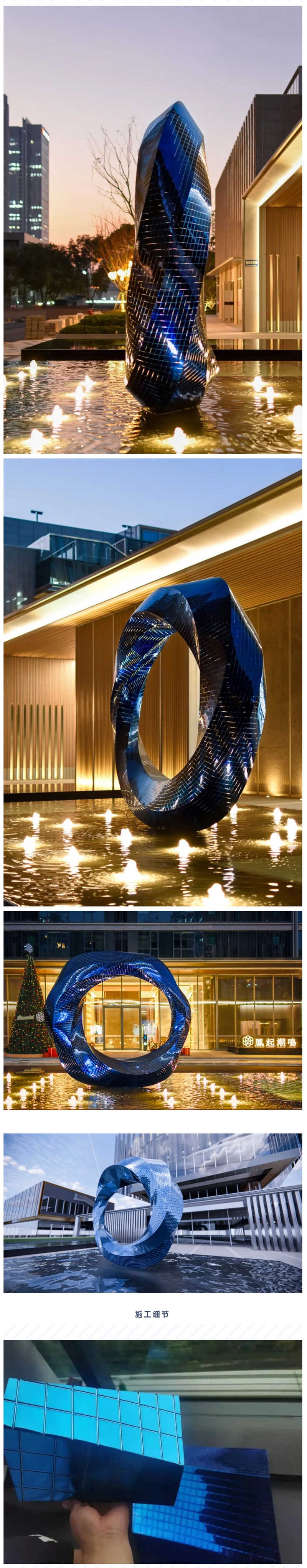 以往彩色鏡面用的都是電鍍工藝,但是受限于常規(guī)尺寸,對于大型雕塑難以應(yīng)用,且有色差,混彩風(fēng)險極大。團(tuán)隊用時五年攻克了這個限制,并結(jié)合鏡面平板無限放大工藝,通過幾十次實驗,終于在這個雕塑上實踐成功。據(jù)我們所知,在不銹鋼上雕刻花紋也是我們這個雕塑率先采用。這兩種工藝都是屬于首發(fā)。