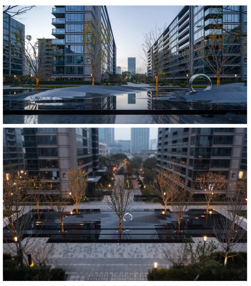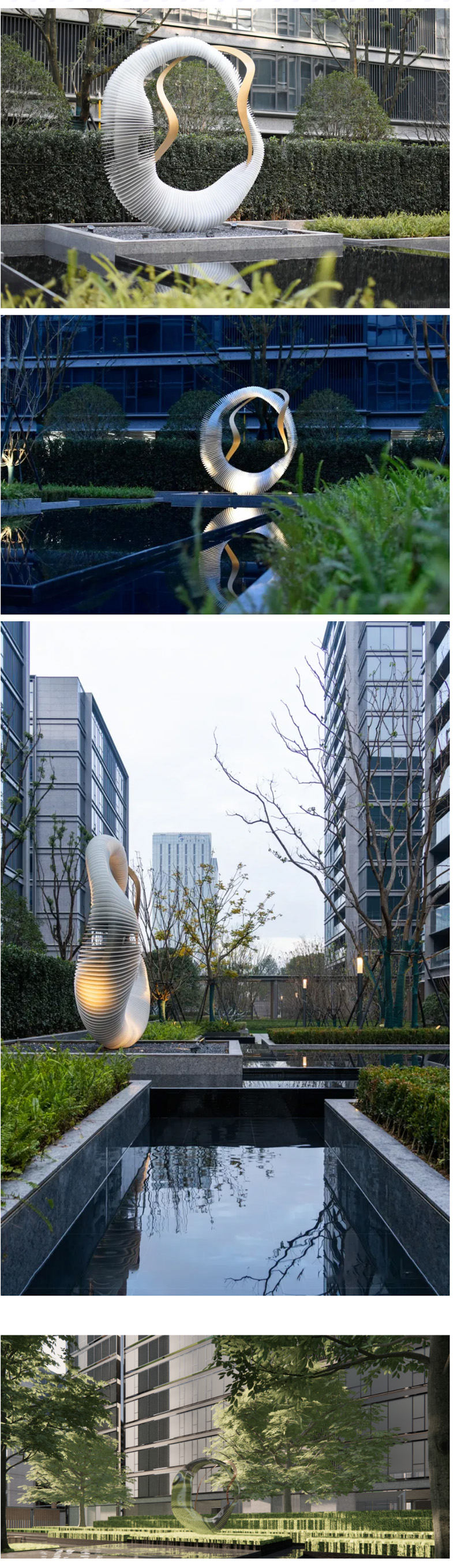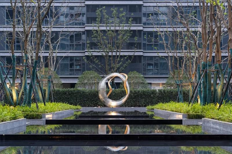 最終的效果也是令人滿意的,印證了“庭園就是一幅畫”的創(chuàng)園理念,作品以借景的方式與原本獨立的空間發(fā)生關(guān)聯(lián),白金配色在綠植水景的映襯下更好的體現(xiàn)出了現(xiàn)代精致感,在景觀之上起到了“畫龍點睛”的作用。