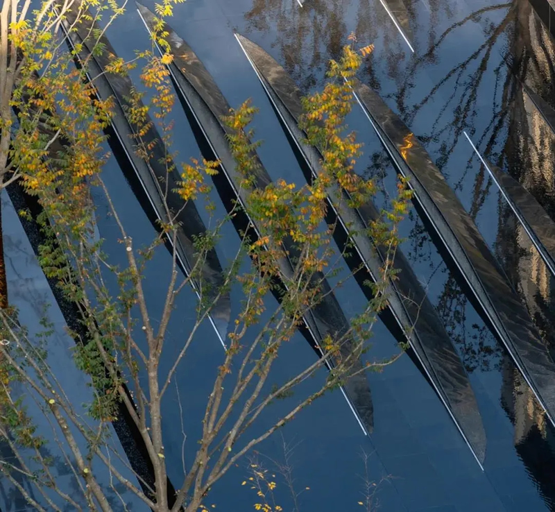 設(shè)計組充分利用水景特征,石材順著水面翻涌而起,質(zhì)感的碰撞與光影的切入,一場文化與藝術(shù)的融合,傳達(dá)出一種對充滿詩意的理想生活的追求和向往,致敬千帆競渡,敢為人先的弄潮精神。