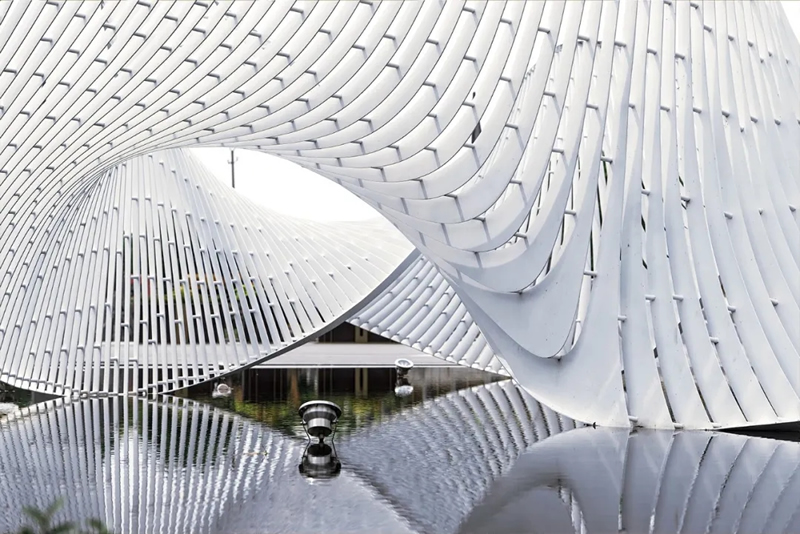 雕塑設(shè)置在水景之上,設(shè)計(jì)師在構(gòu)思設(shè)計(jì)之前對有限的空間和特殊的地理?xiàng)l件進(jìn)行思考和推敲。結(jié)合“綢都”蘇州的本土文化特征,提取“絲綢”和“水鄉(xiāng)”作為抽象設(shè)計(jì)語言,打造出柔美靈動的藝術(shù)作品。