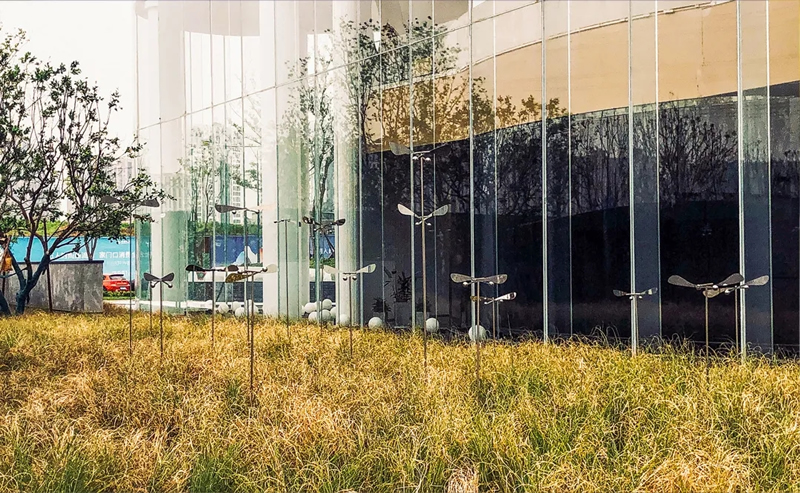 后場雕塑為了激活空間、強(qiáng)化主題,選擇了蝴蝶“飛舞”和“停歇”的幾個(gè)狀態(tài)進(jìn)行創(chuàng)作。一靜一動,兩相宜。
